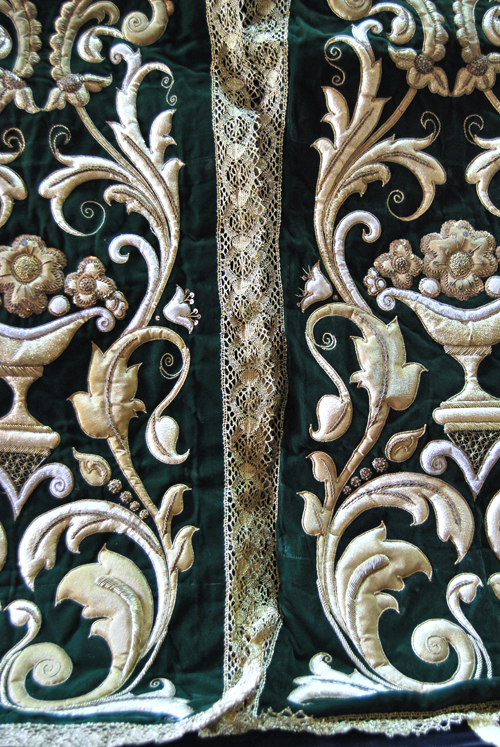 • MANTO DE CAMARÍN VERDE: manto de terciopelo verde corto, donde se sigue el mismo procedimiento decorativo que la saya de los cuernos, con la que combina. Solamente tiene las vistas delanteras recamadas, ya que es para diario o camarín, y también se usa para el besamanos. En el centro de cada lado de dicho manto se disponen cuencos de flores.