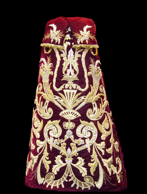 • SAYA TORERA: saya de terciopelo rojo corinto cuyos bordados proceden de los trajes de luces de Diego Aparicio, Diego Puerta y el Litri. Realizada por Rincon Galicia. Combina con un manto azul corto de camarín, este último de un traje de Diego Puerta.