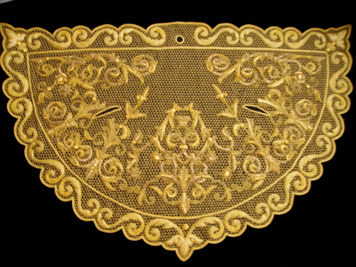 • TOCA DE SOBREMANTO: bordada en realce sobre malla de oro. Con esta prenda Rincón enriqueció aún más el vestuario de la Virgen, en 1974. Restaurada y enriquecida en 2007 por José Manuel Lozano.